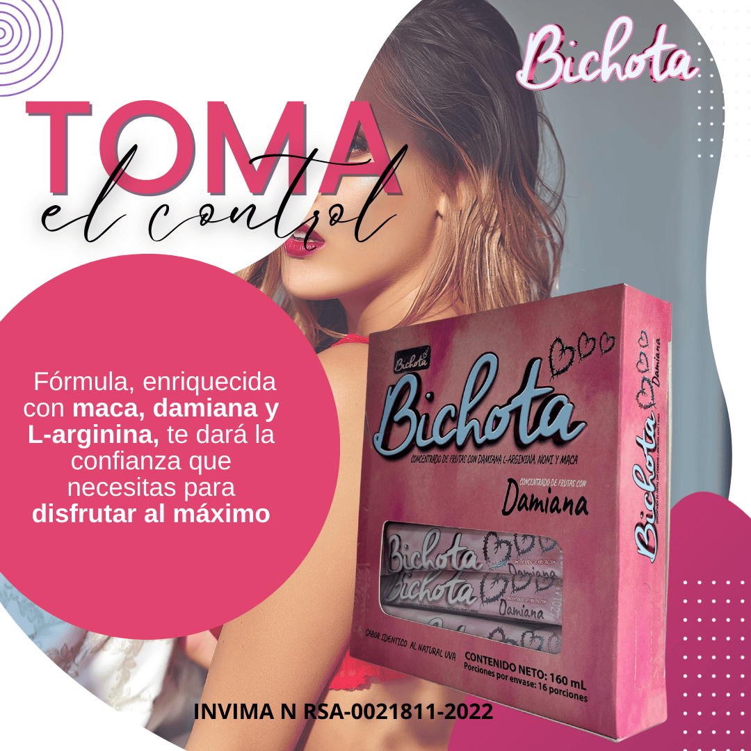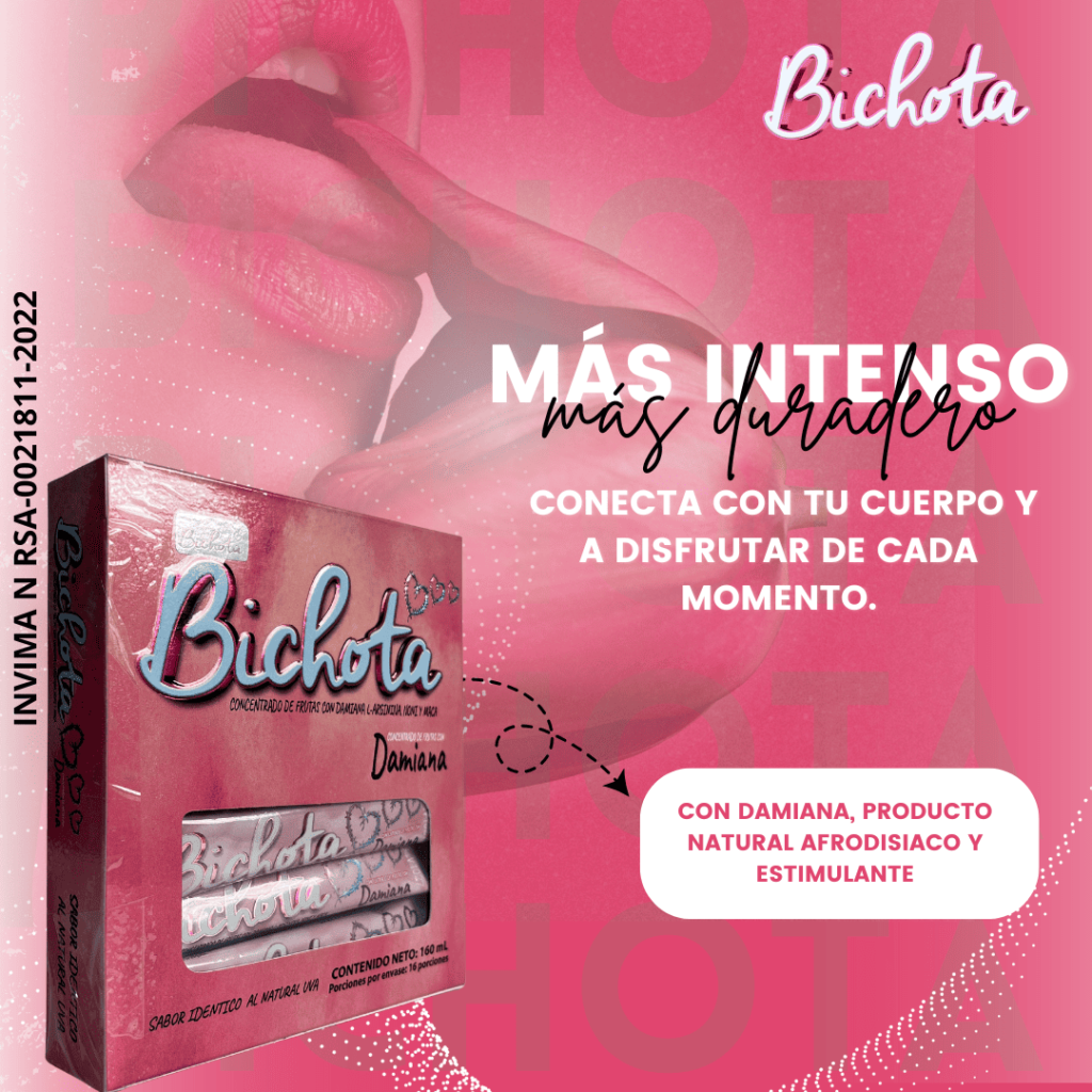 Bichota es tu aliado para ese pre-juego inteligente: una bebida  con delicioso sabor a uva, diseñada para activar tus sentidos y preparar la escena con elegancia. Fórmula con Damiana, Maca y L-Arginina te invitan a dejar la prisa afuera y a entrar en modo presencia total. Además, cuenta con registro INVIMA RSA-0021811-2022, señal de confianza para elegirla sin dudas.