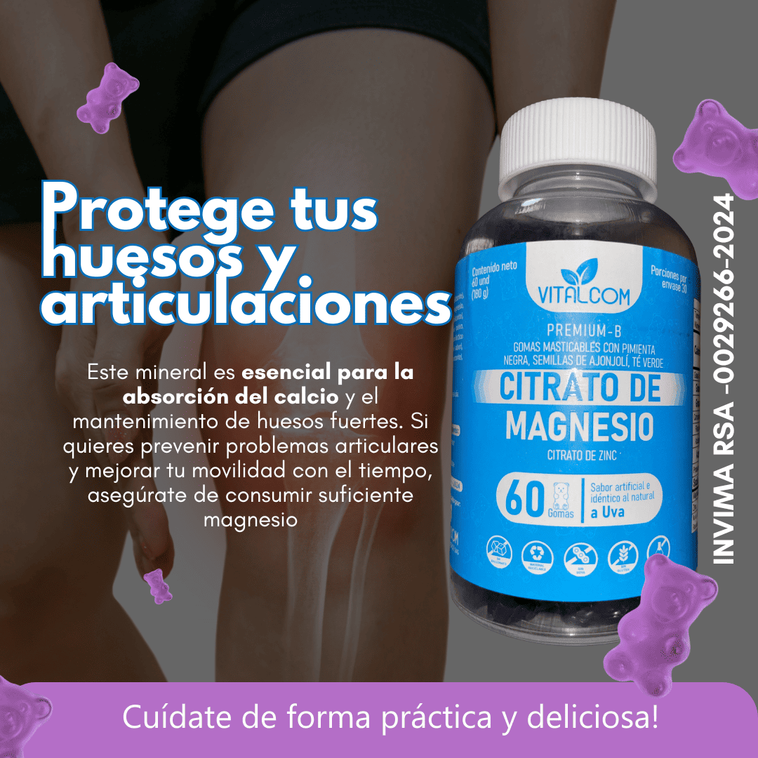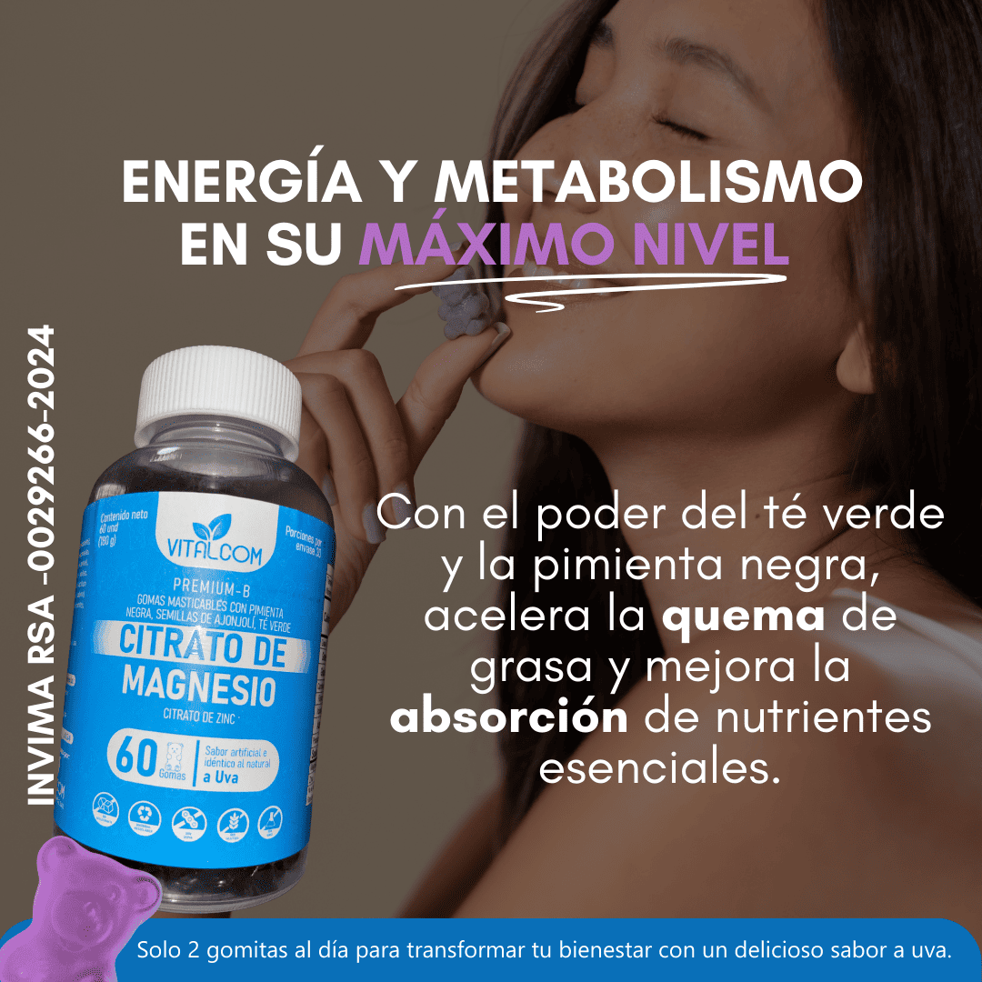 contribuye al rendimiento mental y al metabolismo energético. Nuestra fórmula en formato masticable combina citrato de magnesio con zinc, Producto con registro INVIMA y fabricación local